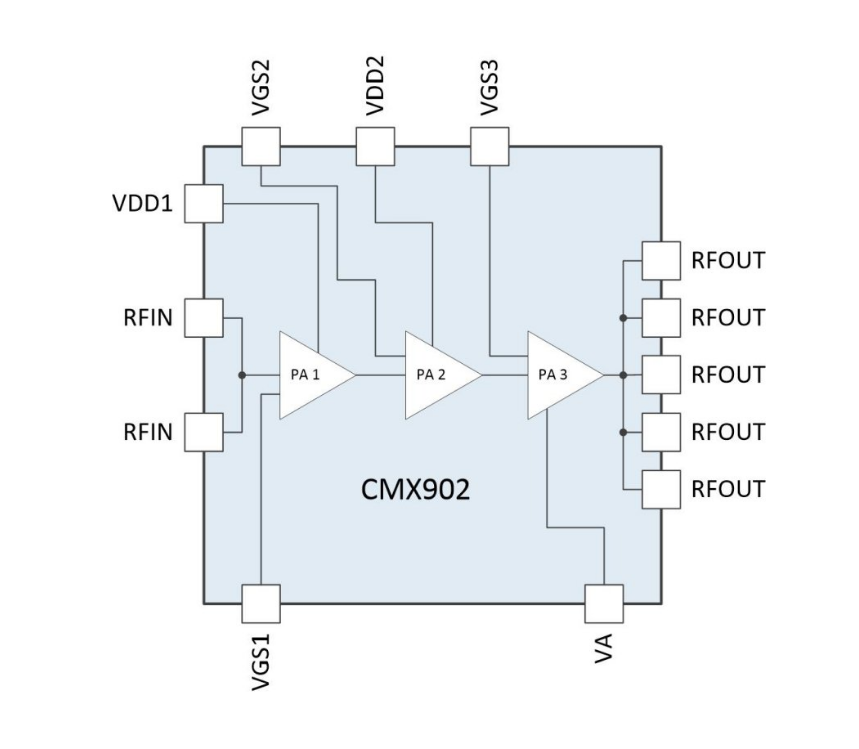 The CMX901 is a three stage high-gain and high efficiency RF power amplifier. The device is ideally suited for use in VHF and UHF frequency bands up to 700MHz.