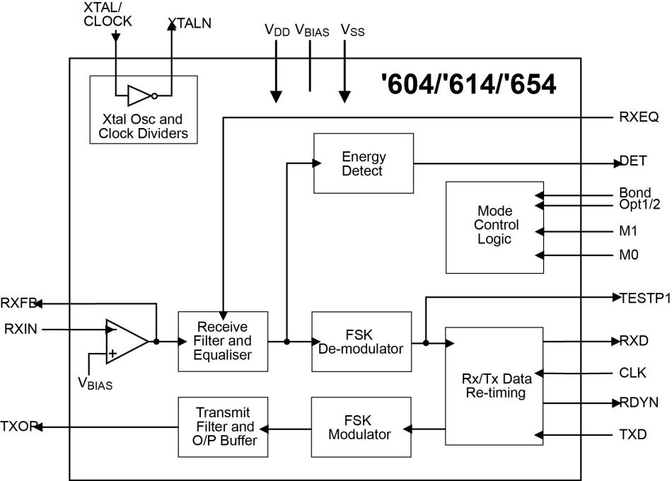 The device incorporates an optional Tx and Rx data retiming function that removes the need for a UART in the associated µC when operating at 1200bits/sec. The device can disable the back channel or be operated so only the mark or space tone is produced. An optional line equaliser is incorporated into the receive path, this is controlled by an external logic level.